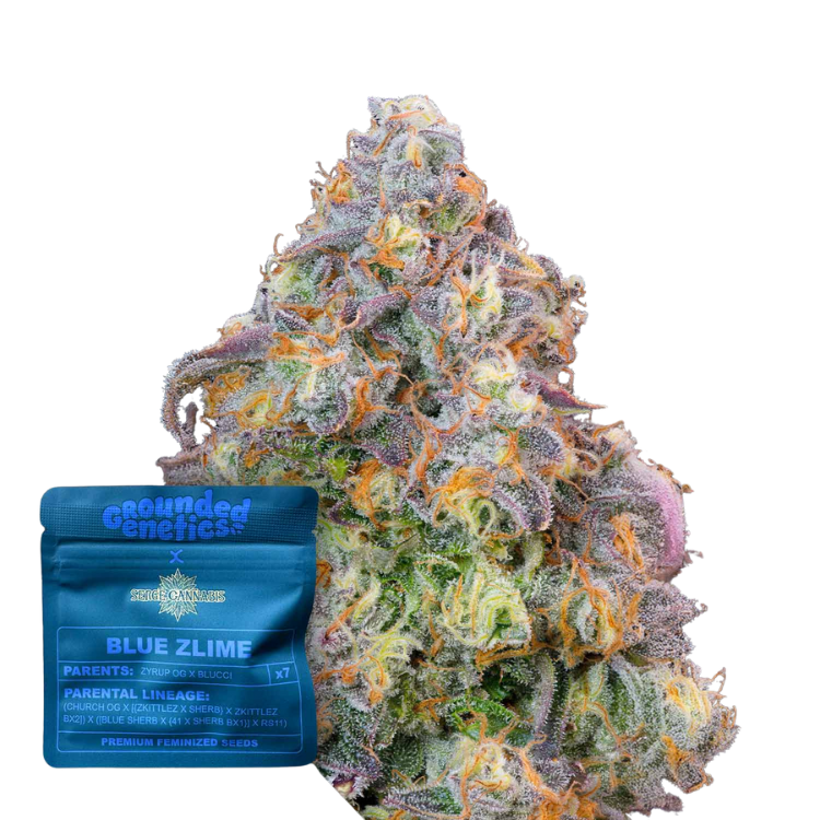Blue Zlime von Grounded Genetics ist eine ausgewogene Hybrid-Sorte mit einem Verhältnis von ca. 40 % Sativa zu 60 % Indica. Die Kreuzung aus Zyrup OG und Blucci liefert kompakte, stabile Pflanzen mit kräftigen Blüten, die während der Reifephase feine blaue Nuancen entwickeln.